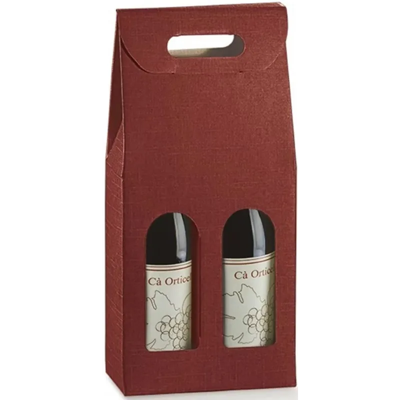 Tato laminovaná kartonová krabice o tloušťce větší než 2 mm, která je ideální pro bary, vinotéky a podniky, které chtějí stylově prezentovat víno, pojme dvě standardní lahve svisle. Dorazí naplocho, sestaví se během několika sekund a uzavře se pomocí robustních vnitřních klop, bez lepidla nebo pásky. Přední okno chrání sklo, ale umožňuje viditelnost štítků, zatímco matný povrch je nabízen ve vínové, zelené, modré, černé, zlaté a havanské barvě, aby ladil s každou produktovou řadou nebo dárkovou sezónou. Je lehký, rychle sestavitelný a plně recyklovatelný, takže dodává profesionální nádech prodeji v obchodech, donáškám jídla s sebou a vánočním dárkům.