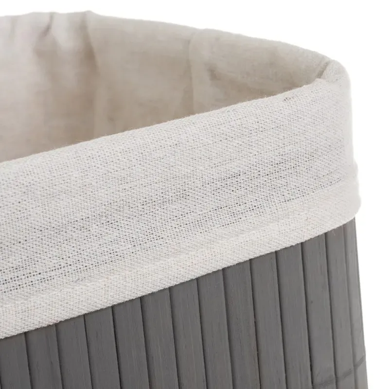 Obdélníkový košík vyrobený z šedého bambusu a vnitřní podšívka z tkaniny 30 % bavlna a 70 % polyester.