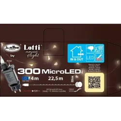 Lineární řetízek M-C 300 MicroLED teplá bílá, studená bílá, vícebarevná, Ø1,5mm, stříbrná kovová stříbrná kabel, paměťový řadič 8 volitelných světelných efektů integrovaných v 12V transformátoru, IP44 venkovní použití, transparentní napájecí kabel, rozměry 4+22,5m, pevná plastová cívka součástí balení.