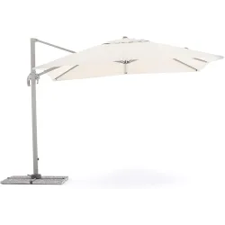 Ομπρέλα κήπου με off-center στύλο και κομψό φύλλο πολυεστέρα, με καθαρή και στεγνή γραμμή. Ο εκτός κέντρου στύλος προσφέρει άφθονη σκιά προς εκμετάλλευση 100%, το φύλλο είναι κατασκευασμένο από πολυεστέρα με επίστρωση PVC 250 gr/τμ. Η δομή είναι κατασκευασμένη από εποξειδικό αλουμίνιο με επίστρωση σκόνης. Η ομπρέλα μπορεί να γείρει σε πολλές θέσεις και διαθέτει σύστημα ανοίγματος στροφάλου, με σύστημα περιστροφής 360° που μπορεί να λειτουργήσει με πεντάλ. Σταυρωτή βάση, πλακάκια δεν περιλαμβάνονται (απαιτούμενο βάρος 120 kg)