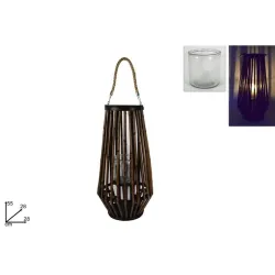 Linterna con varillas de bambú, fácilmente transportable gracias al mango de cuerda. El jarrón de vidrio colocado en el interior conserva la llama de la vela