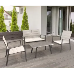 Añade comodidad y estilo a tu espacio exterior con nuestro conjunto de salón jardín, de línea limpia y moderna, compuesto por un sofá de 2 plazas, 2 sillones y una mesa de centro de láminas. La estructura de aluminio pintado ofrece resistencia y durabilidad, y también existe la garantía de protección contra los agentes atmosféricos y los rayos UV con los cojines acolchados de Textilene para un toque de relajación y refinamiento. Con unas dimensiones de 124x71x87 cm para el sofá, 69x71x87 cm para los sillones y 100x55x42 cm para la mesa de centro, este conjunto está pensado para adaptarse perfectamente a tu espacio exterior. Disponibles en blanco, gris, antracita y taupe, con cojines a juego en el mismo color, podrás elegir la opción que mejor se adapte a tu estilo y decoración exterior. Indestructible y muy cómodo, este salón de jardín es perfecto para disfrutar de momentos de relajación y entretenimiento al aire libre con familiares y amigos. Elija nuestro salón de jardín al aire libre para transformar su jardín, patio o terraza en un oasis de confort y estilo.