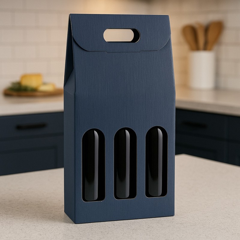 La Caja de Vino para 3 Botellas con Ventana en Cartón Resistente es ideal para transportar y presentar tres botellas de forma elegante y segura. Hecho de cartulina duradera, ofrece una protección sólida, manteniendo las botellas estables y seguras. La ventana frontal transparente añade un toque estético, permitiendo ver inmediatamente el contenido y realzando la apariencia de los buenos vinos, aceites o licores. Disponible en varios colores, se adapta perfectamente para su uso en bares, restaurantes y vinotecas, pero también es perfecto para empaquetar regalos. La caja, diseñada para garantizar la estabilidad y el cierre seguro, es reciclable, lo que representa una opción sostenible para aquellos que desean un embalaje refinado y responsable. Dimensiones: mm 270x90x385