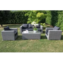 Kültéri nappali, amely a következőkből áll: 3 személyes kanapé, 2 fotel, dohányzóasztal. Szerkezet alumíniumból és polirattanból (Wicker). 17 cm-es párnázott poliészter párnák.
