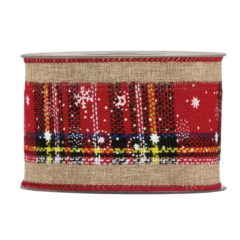 Het dubbele lint is een rustiek decoratief kerstlint, met een centrale decoratie in tartanstijl verfraaid met sneeuwvlokken. Hij is 63 mm breed en 10 meter lang en is verkrijgbaar in de varianten rood/blauw en rood/groen. Ideaal voor volumineuze strikken, het is perfect voor het versieren van kerstbomen, slingers en festoenen.