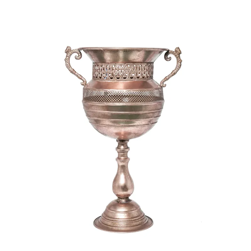 Beker gemaakt van roze metaal, origineel ornament of prachtig middelpunt verrijkt met kaarsen.