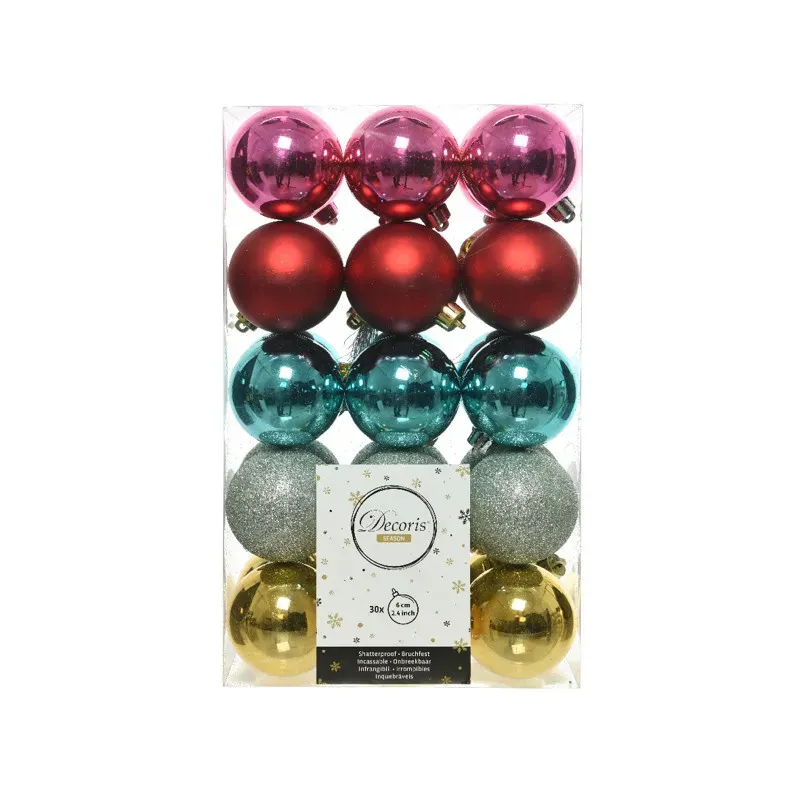 Onbreekbare kogels met diameter cm. 6 in een verpakking van 30 stuks. De kleuren zijn al op elkaar afgestemd.
