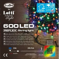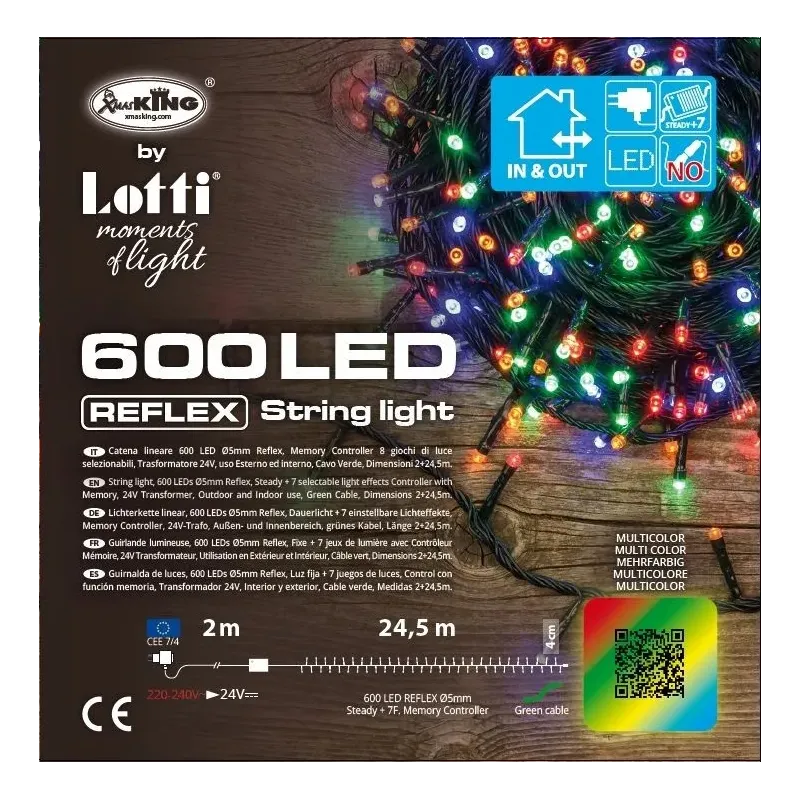 TLE 600 LED Linear Chain - verkrijgbaar in Cool White en Multicolor. - Ø5 mm Reflex, Timer Memory Controller 8 selecteerbare lichteffecten met aan-uit-timer 8-16 uur kunnen worden losgekoppeld via verlichte knop, laagspanningstransformator, buitengebruik, groene kabel, afmetingen 2+24,5 m.