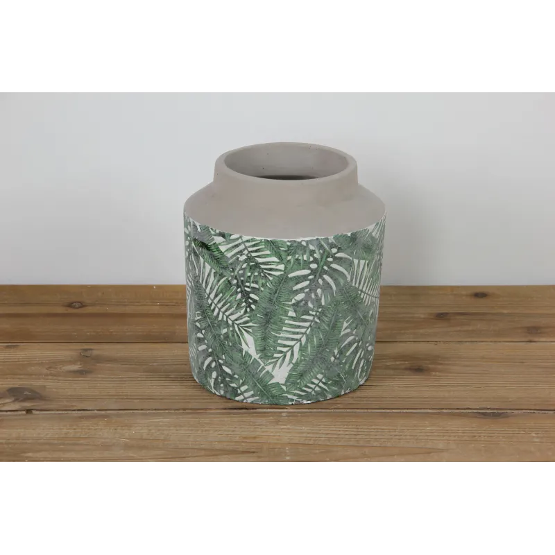 Wazon z egzotycznymi odniesieniami dzięki wzorowi palm, dostępny w dwóch rozmiarach: 18x18x22 lub 16,5x16,5x18,5