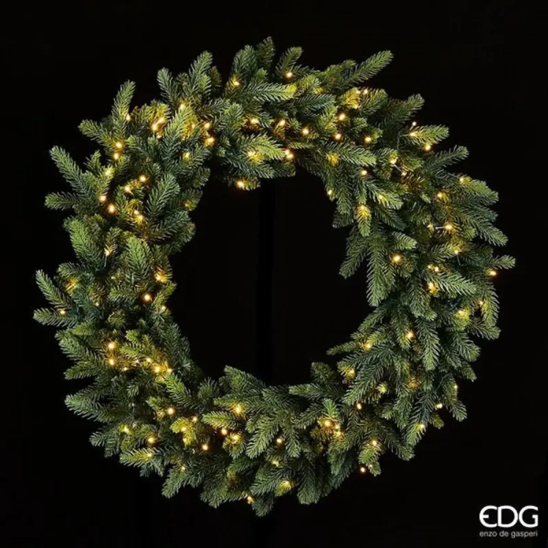 Podnieś swoją świąteczną dekorację dzięki luksusowej zielonej koronie z diodami LED firmy EDG, zawierającej mieszankę gałęzi PE + PVC i ciepłych białych oraz zewnętrznych świateł LED IP44 3,6 W 3V0,02A 230 VA. C 50HZ-31VD. Długość 5 m. Dzięki możliwości wyboru średnic 60 i 80 cm, ta korona doda luksusowego i tradycyjnego akcentu Twojemu wakacyjnemu otoczeniu. Wykonany z wysokiej jakości materiałów, reprezentuje doskonałość w świątecznym designie. Idealny do drzwi wejściowych i ścian. Kup teraz, aby uzyskać odrobinę elegancji w swoim świątecznym wystroju! Made by EDG di Enzo De Gasperi: firma wyprodukowana we Włoszech, lider w dziedzinie designerskich akcesoriów wyposażenia wnętrz, wszystkie produkty EDG wyróżniają się oryginalnością i niepowtarzalnym stylem.