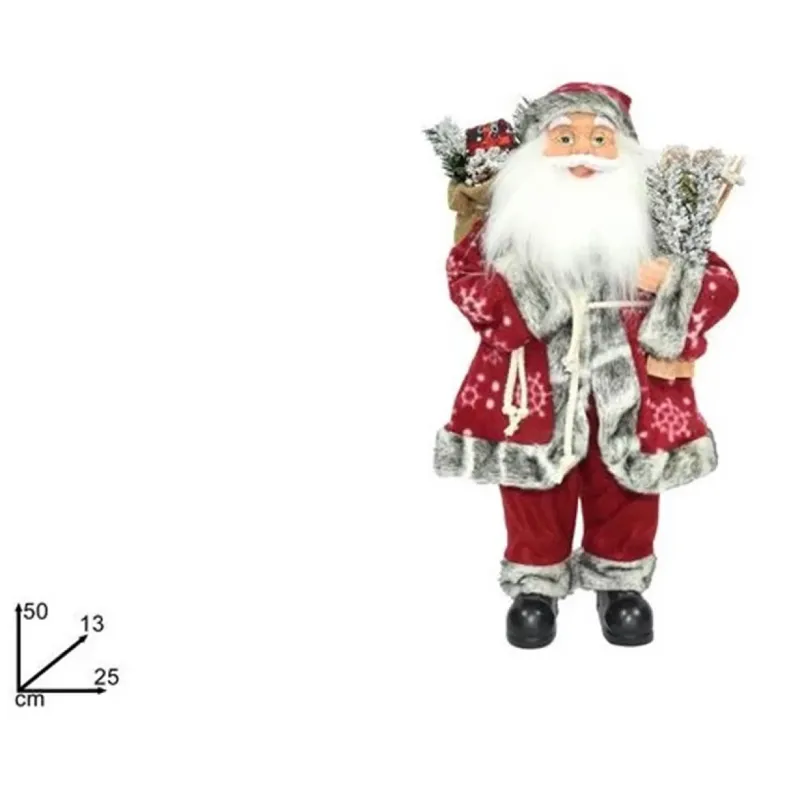 Obejmuje swoje narty i trzyma worek z prezentami.