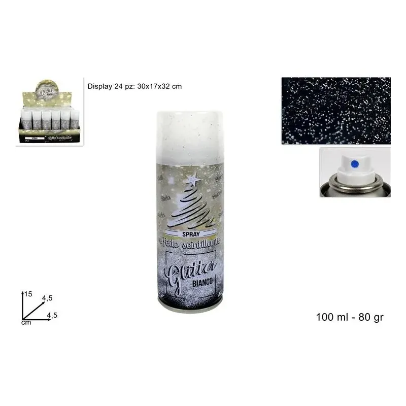 Biały, złoty i srebrny brokat w sprayu.