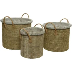 Okrągły i sztywny kosz wykonany z plecionej bawełny: jasnoszary wewnątrz, naturalny kolor na zewnątrz. Wyposażony w sztywne uchwyty.