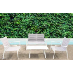 Salon ogrodowy na świeżym powietrzu składający się z: 2-osobowej sofy, 2 foteli, stolika kawowego. Konstrukcja aluminiowa malowana. Beżowe poduszki tapicerowane textilene. Niezniszczalna i bardzo wygodna.