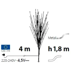 Odgałęzienie dostępne w wariancie białym lub brązowym Micro BRANCH H180cm 576 MicroLED CLASSIC Ø1,5mm, srebrny metalowy lub miedziany metalowy, stałe światło, formowalny z metalowym rdzeniem, transformator 4,5 V, do użytku na zewnątrz, pierścień w podstawie do zamocowania lub zawieszenia, biały lub brązowy zasilający, wymiary 4m + H180cm.