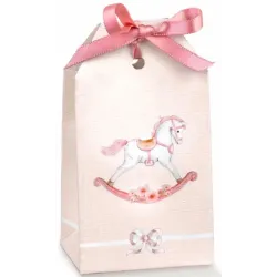 Saszetki na migdały w cukrze to praktyczne rozwiązanie do szybkiego i łatwego pakowania migdałów w cukrze i słodyczy. Nadruk bujanego kucyka pozwoli Ci stworzyć szybkie, praktyczne i eleganckie upominki na chrzest, narodziny lub przyjęcie z okazji ujawnienia płci.