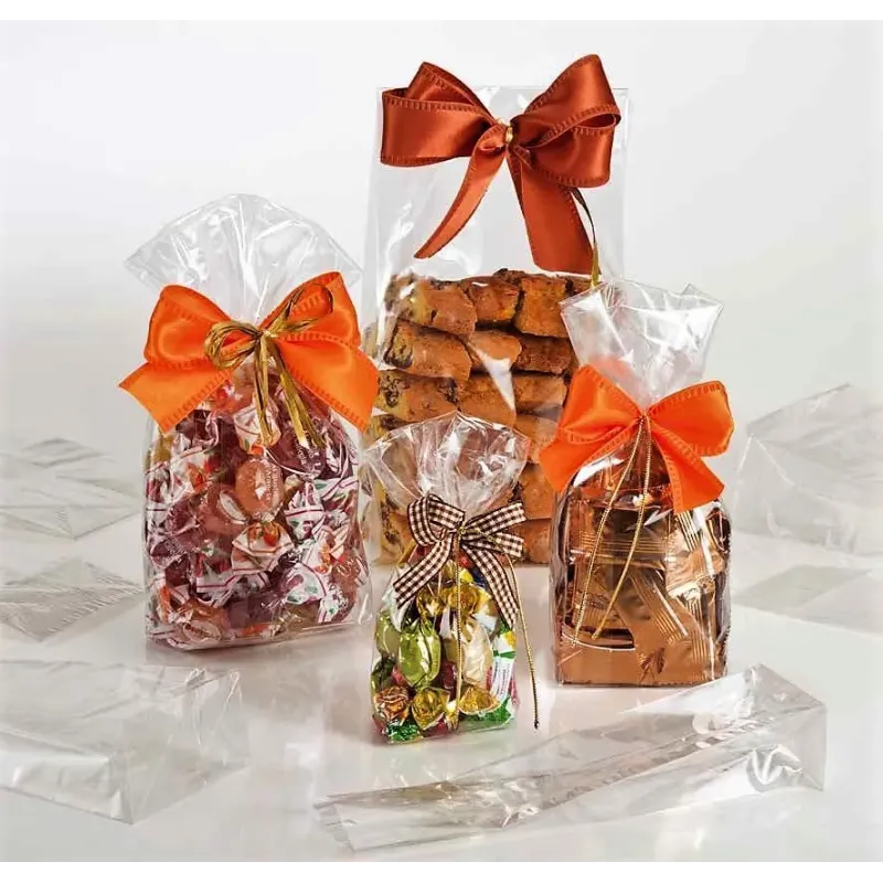 Te krystaliczne torby celofanowe, wykonane z polipropylenu przeznaczonego do kontaktu z żywnością, mają wstępnie przyklejone kwadratowe dno, dzięki czemu stoją samodzielnie: napełniaj herbatniki, drażetki lub małe gadżety bez użycia rąk i zamykaj taśmą lub zwykłą naklejką. Wyważona grubość zachowuje doskonałą przezroczystość bez poświęcania wytrzymałości; Boczny klin otwiera objętość i podąża za nieregularnymi kształtami. Dostępne w kilku rozmiarach, dostarczane są w opakowaniach po pięćdziesiąt płaskich i lekkich elementów, gotowych przekształcić każdy produkt w dobrze wykończony i profesjonalny prezent. Po zużyciu są poddawane recyklingowi na plastik, łącząc estetykę i dbałość o środowisko.