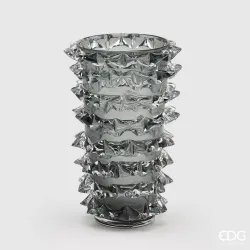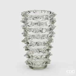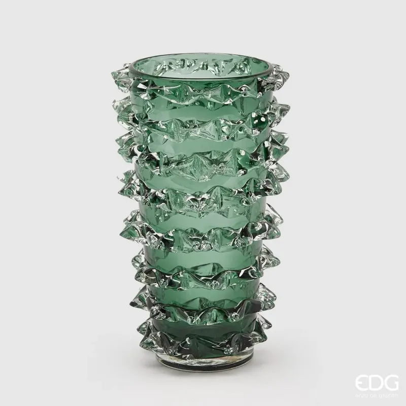 Szklany wazon z końcówkami h35 marki EDG to mebel o zdecydowanie oryginalnym designie, zaprojektowany tak, aby nadać charakteru i stylu każdemu otoczeniu. Wykonany z wysokiej jakości szkła, posiada zewnętrzną powierzchnię zaznaczoną licznymi ozdobnymi wypukłościami, które nadają ruch i szczególne odbicia, zwłaszcza od światła. Smukły cylindryczny kształt (alto około 35 cm) nadaje się do średniej wielkości kompozycji kwiatowych, ale ten wazon może również służyć jako przedmiot czysto ozdobny.