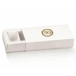 Pack de 10 caixas de cartão planas brancas com Hot Stamping Dourado, equipadas com uma gaveta para amêndoas açucaradas com faixas internas para poder dividir e inserir doces variados.
