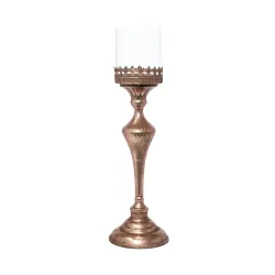 Suporte de vela de metal rosa com gravuras decorativas. Uma peça de mobiliário elegante e moderna, este castiçal de metal rosa é um exemplo de como um simples acessório pode transformar uma divisão. A sua estrutura esbelta e as pequenas gravuras decorativas cuidadosamente trabalhadas conferem-lhe um toque de luxo discreto que se encaixa perfeitamente em espaços modernos e clássicos. Disponível em três versões, cada uma com detalhes únicos que realçam a sua versatilidade, este castiçal é ideal para adicionar calor e elegância a qualquer ambiente, desde o mais minimalista ao mais ricamente mobilado.