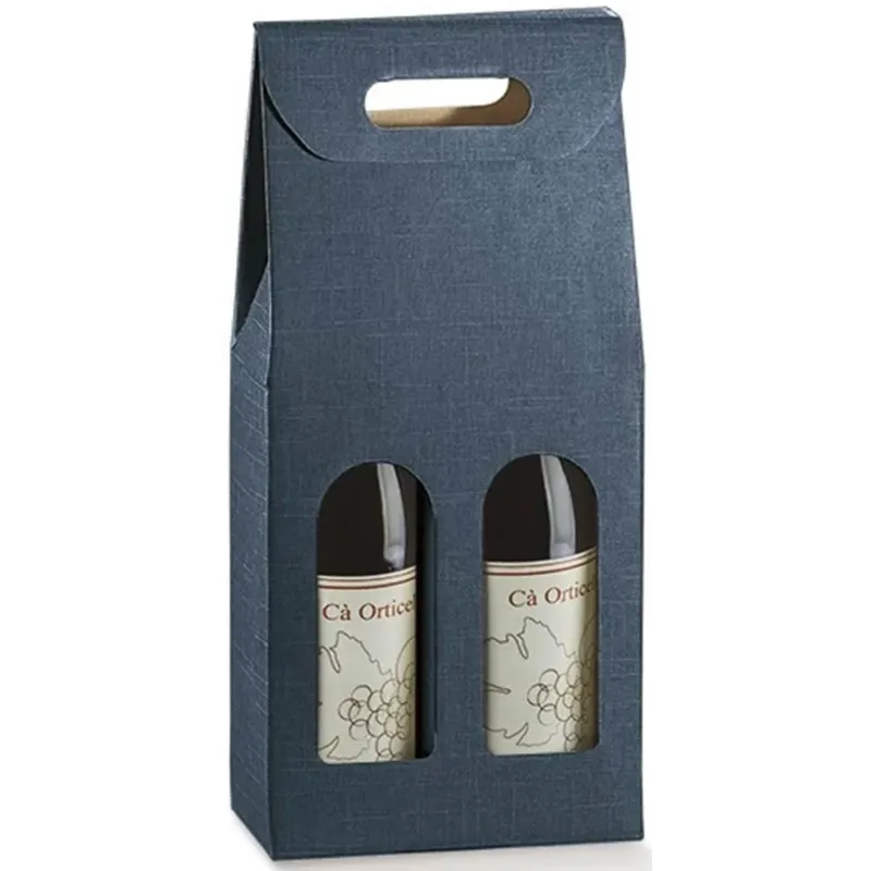 Perfekt för barer, vinbutiker och företag som vill presentera vin med stil, denna laminerade kartong på över 2 mm rymmer två standardflaskor vertikalt. Den kommer platt, monteras på några sekunder och stängs med robusta invändiga flikar, utan lim eller tejp. Det främre fönstret skyddar glaset men låter etiketterna synas, medan den matta finishen erbjuds i vinrött, grönt, blått, svart, guld och Havanna för att harmonisera med varje produktlinje eller presentsäsong. Den är lätt, snabb att montera och helt återvinningsbar och ger en professionell touch till försäljning i butik, takeaway-leveranser och julklappar.