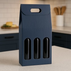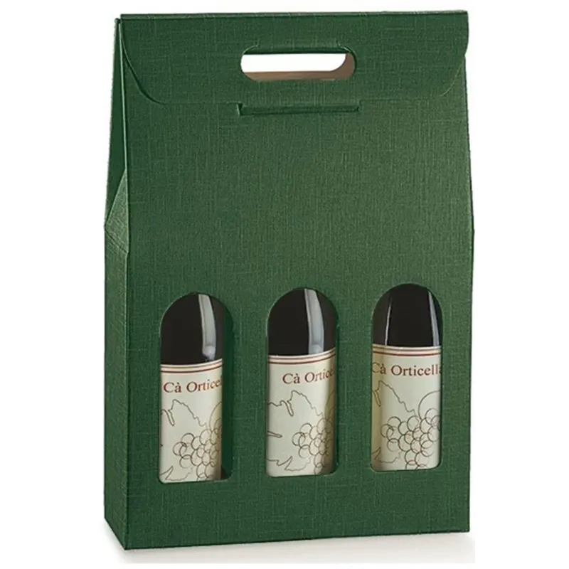 Denna laminerade kartong på över 2 mm är designad för dem som arbetar med vin varje dag och rymmer tre Bordeaux-flaskor vertikalt. Den kommer platt, monteras på några sekunder och stängs lätt, det integrerade handtaget stänger förregling och gör den lätt att transportera. Det stansade fönstret framhäver etiketterna utan att lägga till plast, medan den matta finishen som finns i färgvarianter: vinrött, grönt, blått, svart, guld eller Havanna, matchar alla produktlinjer eller presentsäsonger. Efter användning viks lådan ihop och läggs i pappret, vilket ger en snygg, praktisk och återvinningsbar förpackning.