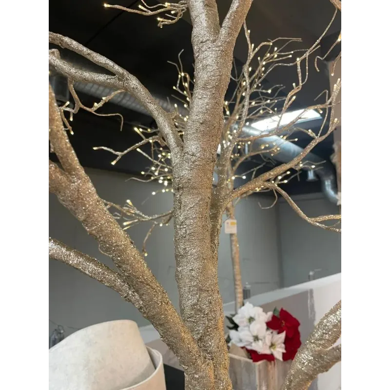 Champagneträd med glitter och ultraljusa lysdioder. Champagnegranen med glitter och LED är en modern och elegant juldekoration, designad för att ge en touch av klass och ljusstyrka till inomhusmiljöer. Med sin gnistrande design och varmvita LED-lampor är detta träd perfekt för att skapa en sofistikerad och välkomnande atmosfär, perfekt för berikande juldekorationer.