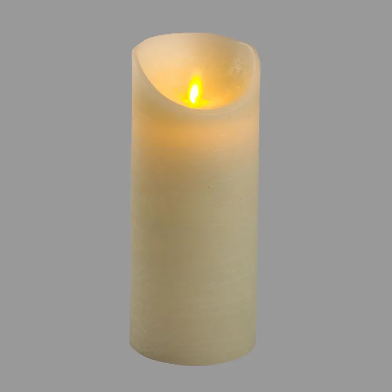 Cylindriskt ljus Ø7,5cm - finns i varianterna H10cm, H13cm, H 15cm - Elfenbensvax Grov finish VARMVIT LED, Moving Flame MOVING FLAME, On-Off Timer 6-18 timmar (kan uteslutas), kompatibel med IR On-Off fjärrkontroll mod. XT-RC1 (ingår ej), 3xAAA-batteri, IP20 Bärbar användning