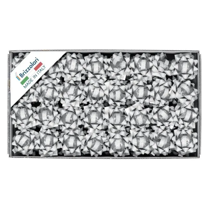 36 olika eller enfärgade rosetter i glittrad polypropen, användbara för att dekorera dina presentförpackningar.