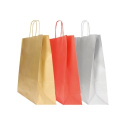 Förpackning med 25 shoppare med sladdhandtag, tillgängliga i tre storlekar, i guld, rött och silversortiment. Tillverkad av robust papper, perfekt för eleganta och koordinerade julklappsförpackningar.