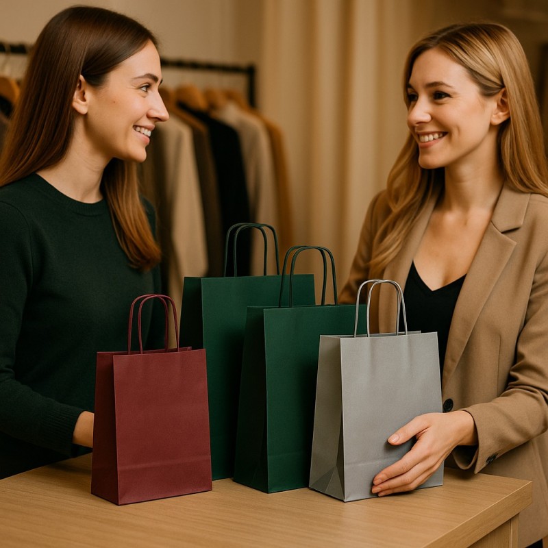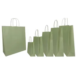 Paket med 25 Shoppers i högkvalitativt färgat papper med matchande sladdhandtag. Den eleganta och robusta lösningen för din butiks förpackning.